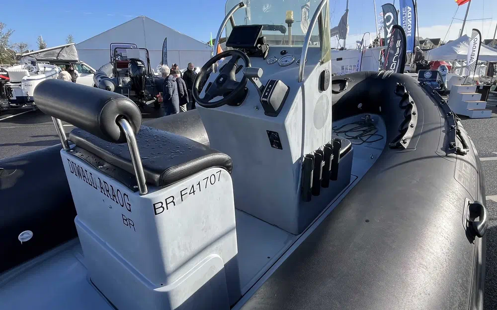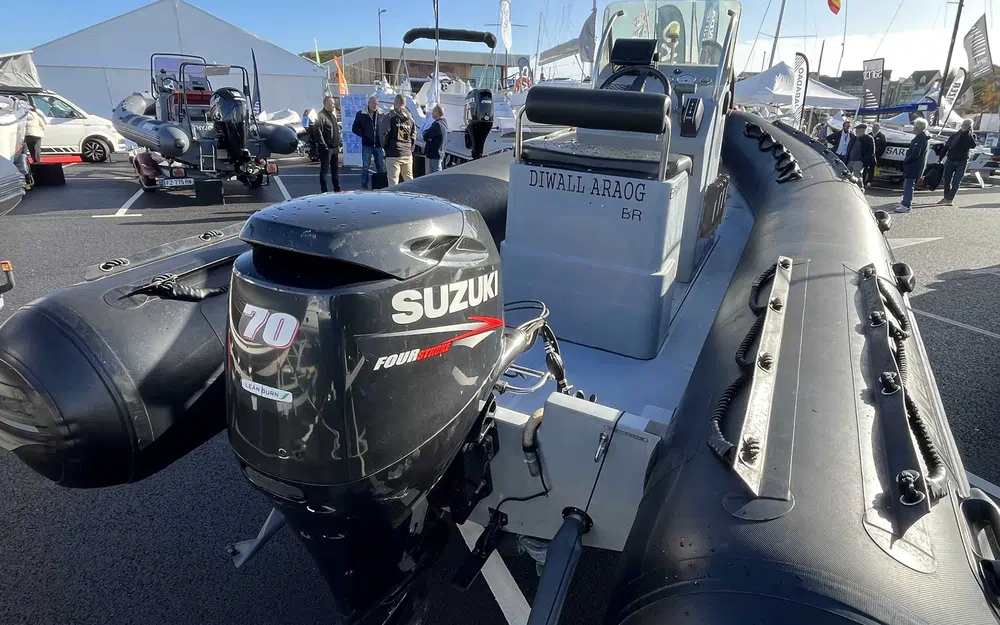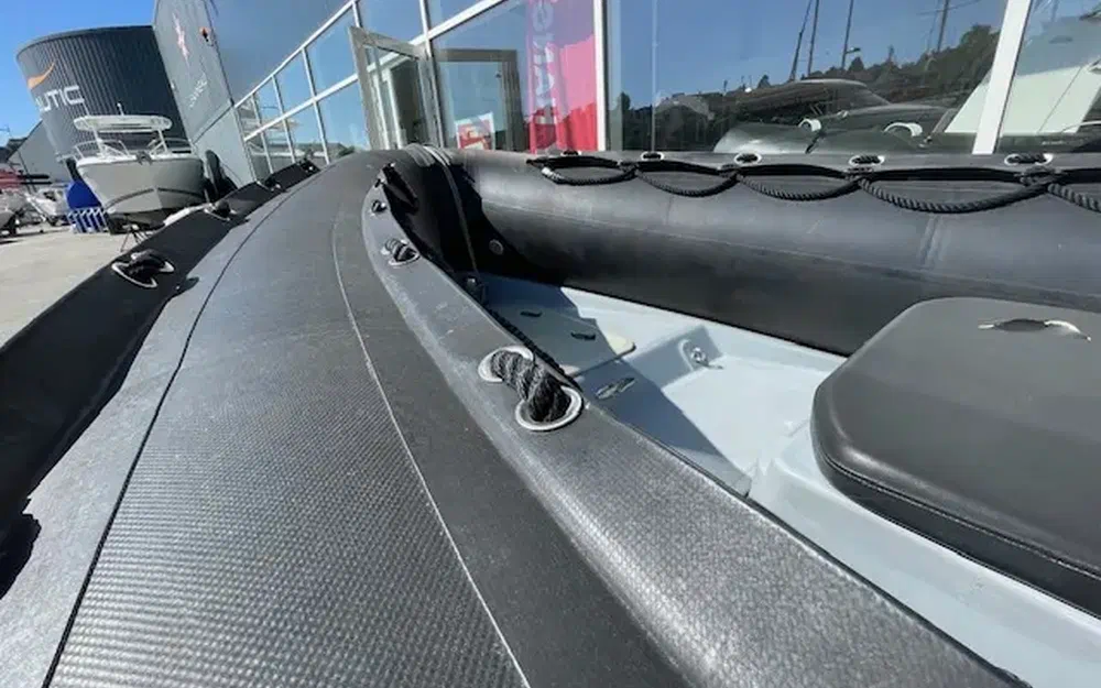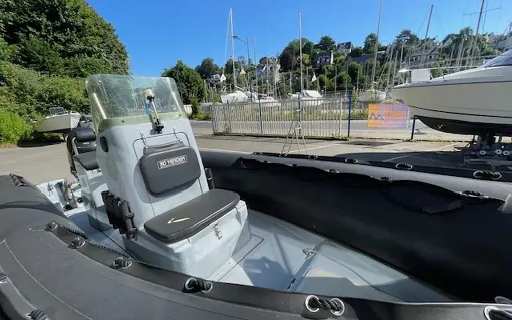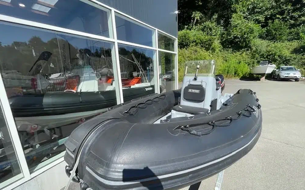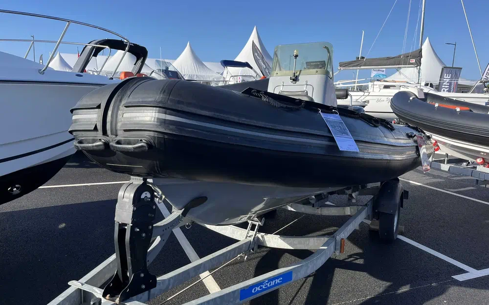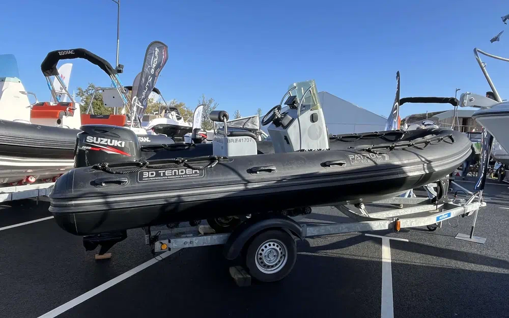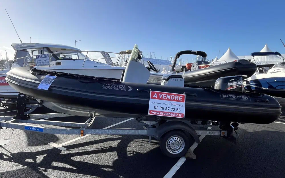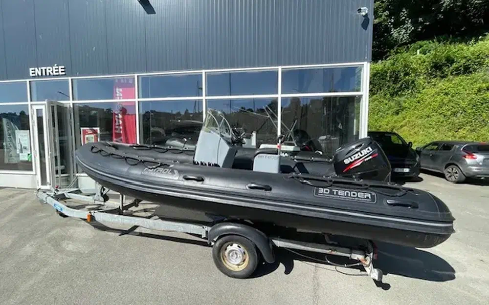Ensemble occasion 3d Tender Patrol 550 flotteur pvc noir avec sa motorisation Suzuki df70 totalisant 360 h et remorque Océane neuve ptac 1000 kgs.