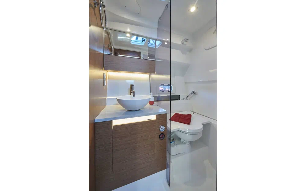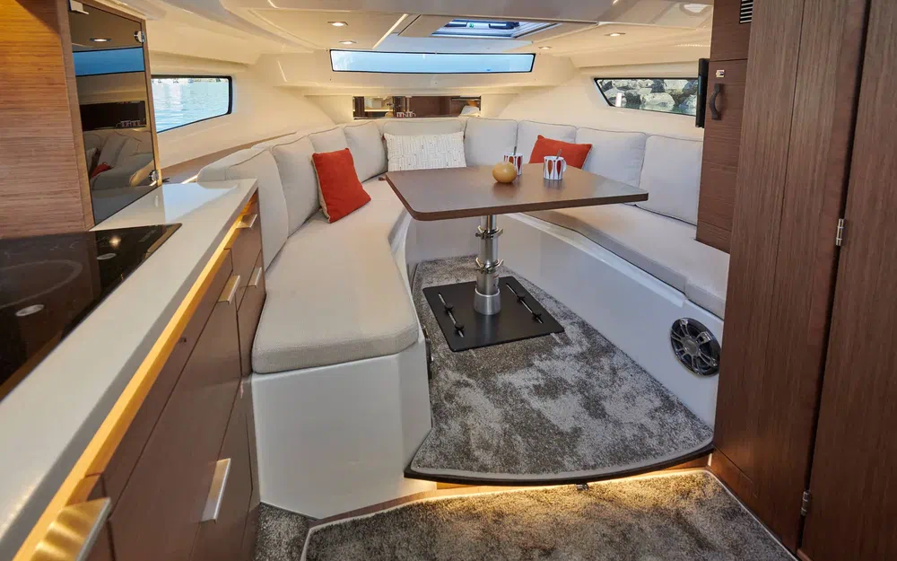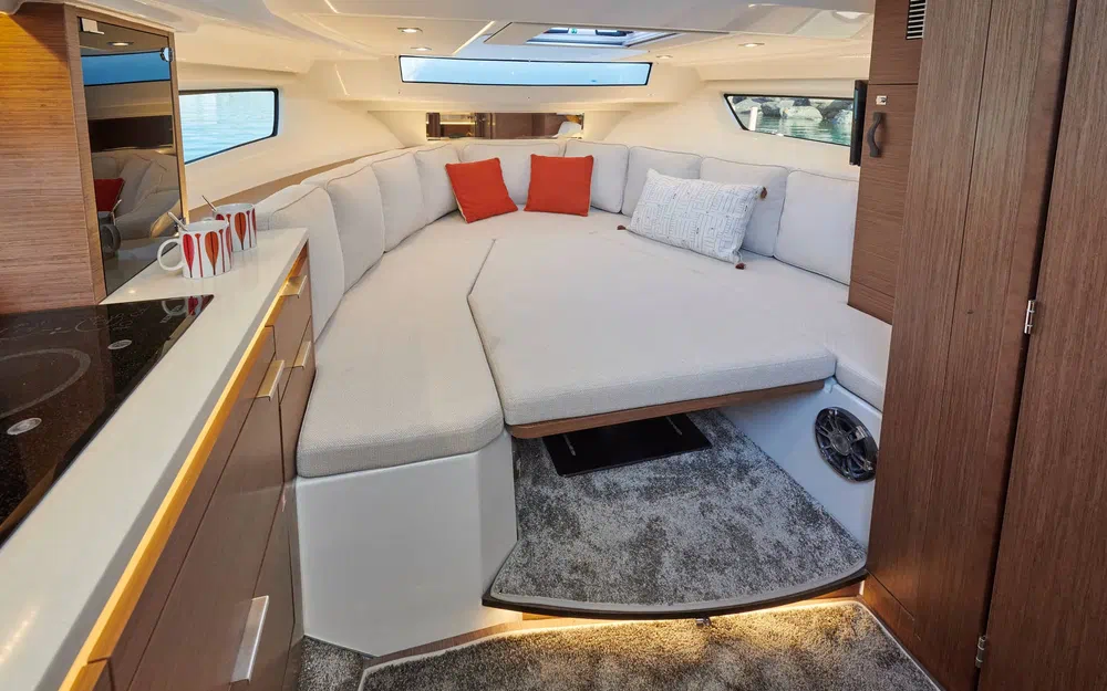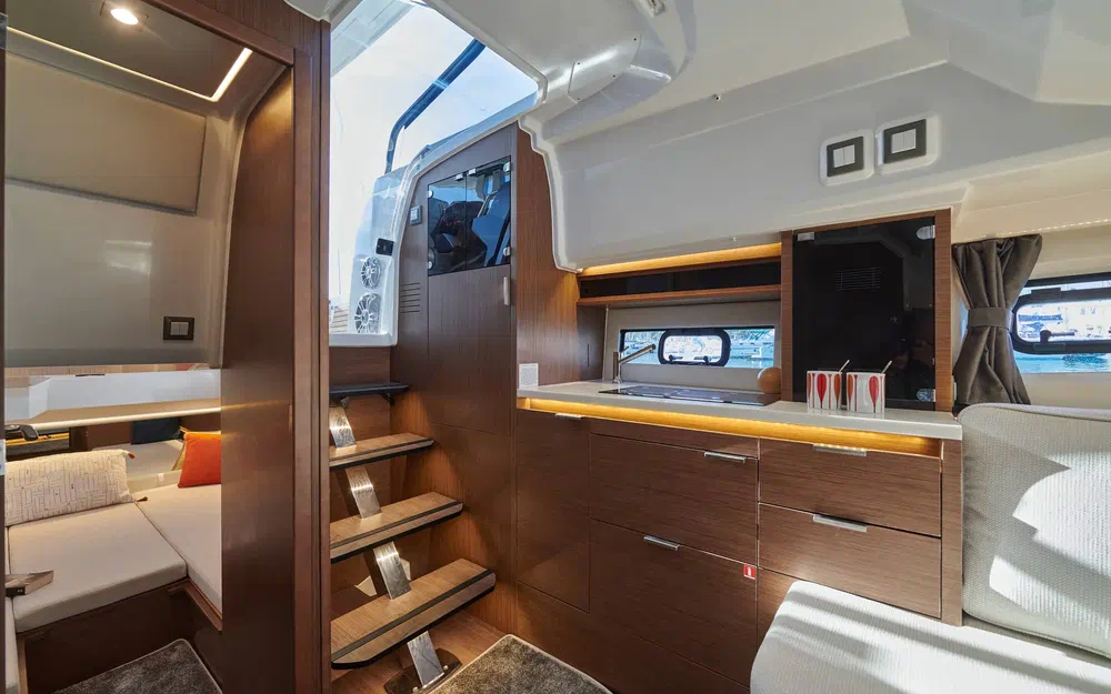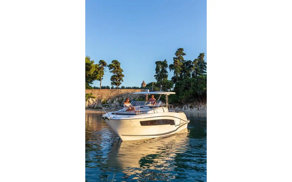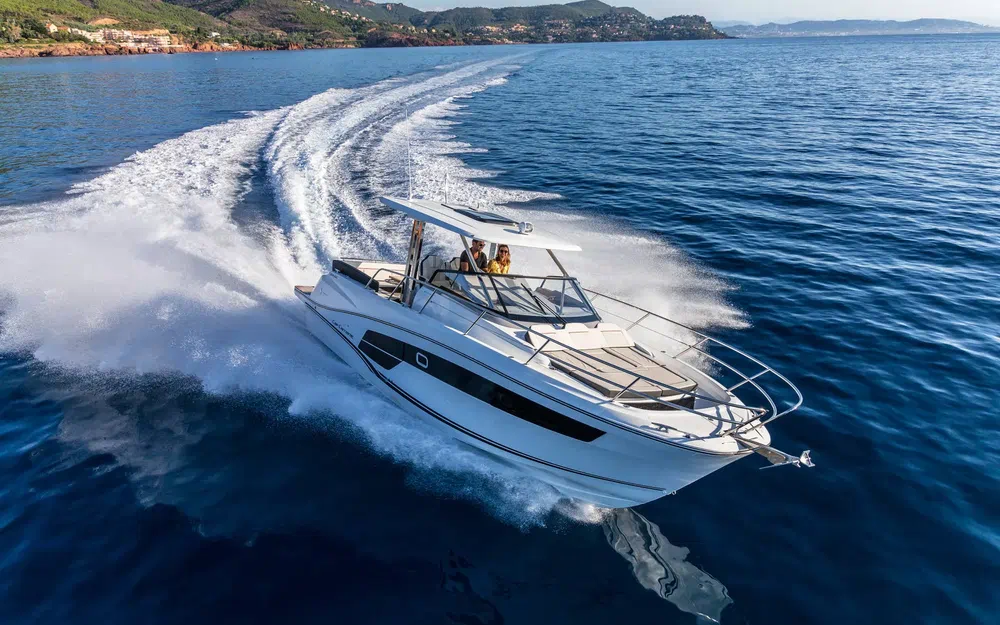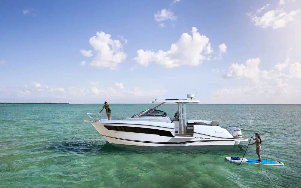 Le Cap Camarat 10.5 WA se décline désormais en une ligne « pare-brise intégral ». Ce pare-brise haut et enveloppant dessine très nettement une zone de pilotage encore mieux abritée des éléments. Bien protégés, le pilote et ses copilotes pourront toutefois sentir le vent du large grâce à un système de ventilation situé au sommet de la vitre centrale. Le complément de confort offert par le pare-brise intégral permet d’être encore plus en confiance face aux éléments, de naviguer sereinement tout en profitant pleinement des performances du bateau. Avec cette nouvelle version, le style global du bateau a été repensé pour un look plus affirmé et un aspect plus sportif.