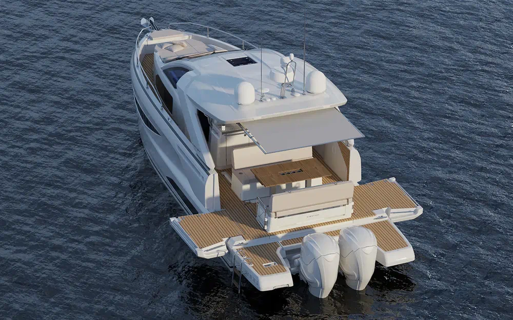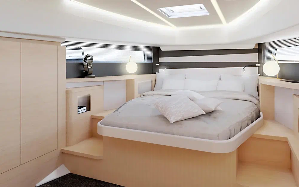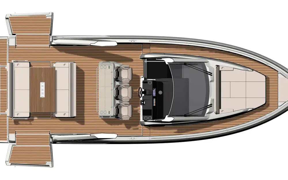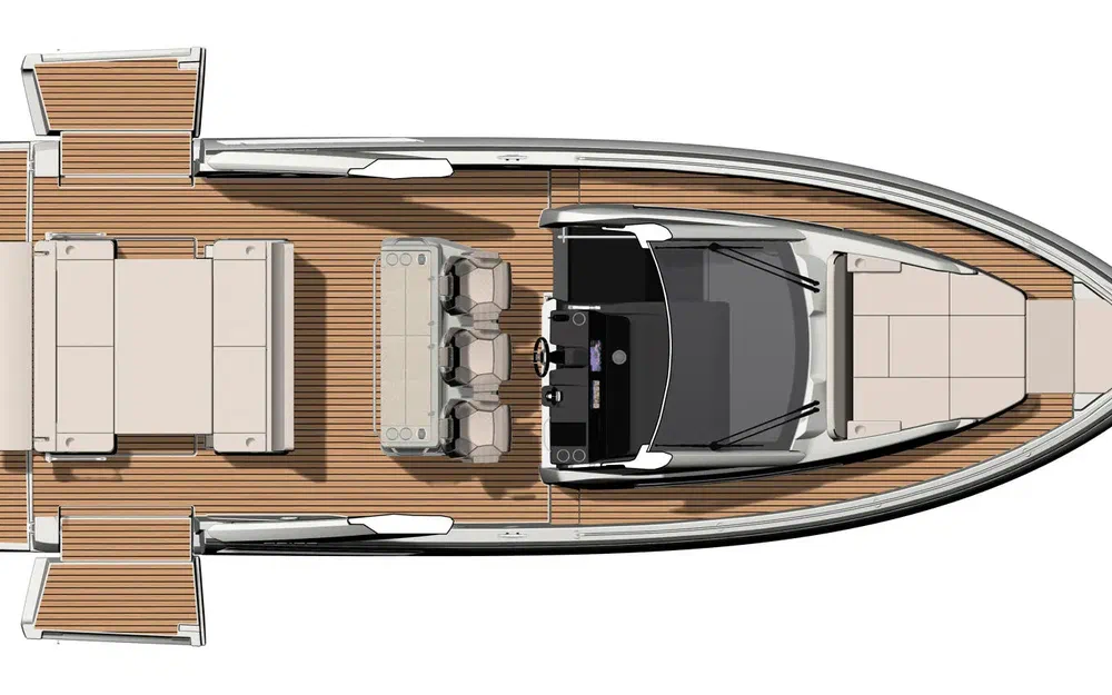 Des lignes épurées, un tempérament affirmé, un style teinté de sportivité… Le DB/37 ne passe pas inaperçu. Si ce Day Boat impressionne d’abord par son allure, c’est sa conception qui étonne. Son plan de pont, offre une fluidité de circulation et une sensation d’espace remarquables. En navigation, vitesse, confort et sécurité se conjuguent. Les invités prennent place aux côtés du pilote face à un grand pare-brise intégral, de confortables sièges individuels à l’abri d’un sport top fixe, ou encore, au soleil, dans le cockpit avant, accessible via deux larges passavants sécurisés. Au mouillage, le cockpit arrière se transforme en immense espace de vie, ouvert sur l’eau et la baignade grâce aux terrasses électriques qui se déploient latéralement.