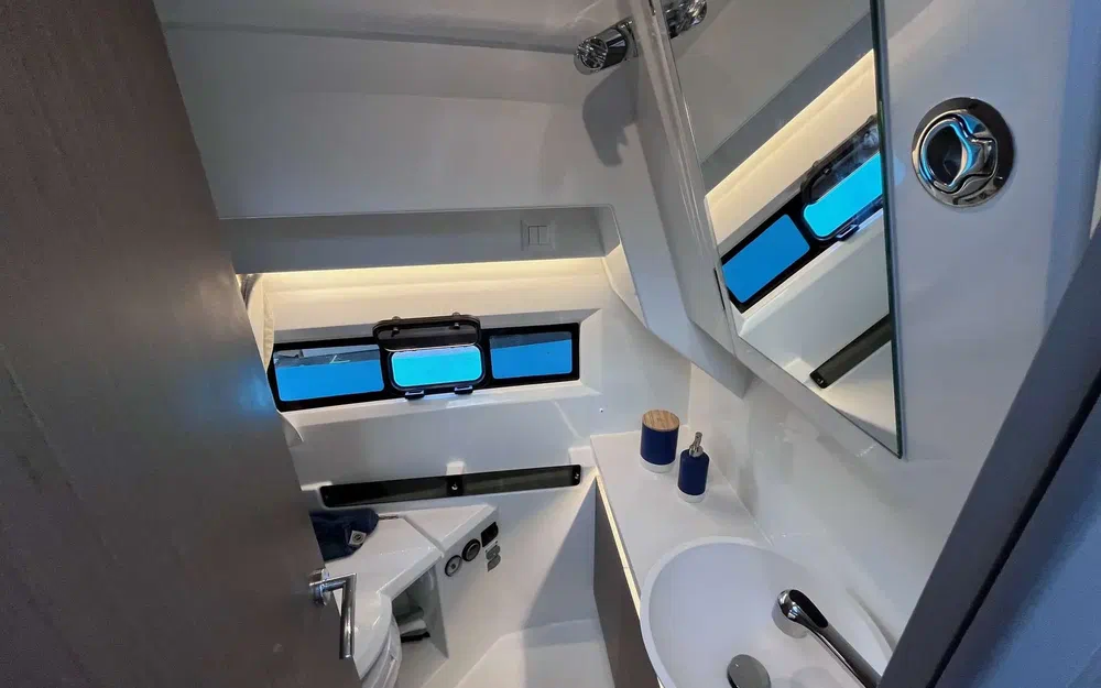 La cabine principale, aux larges ouvertures, est équipée d’une salle d’eau avec douche et WC marins.