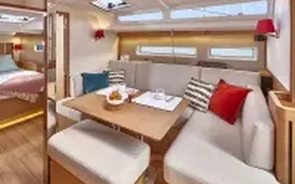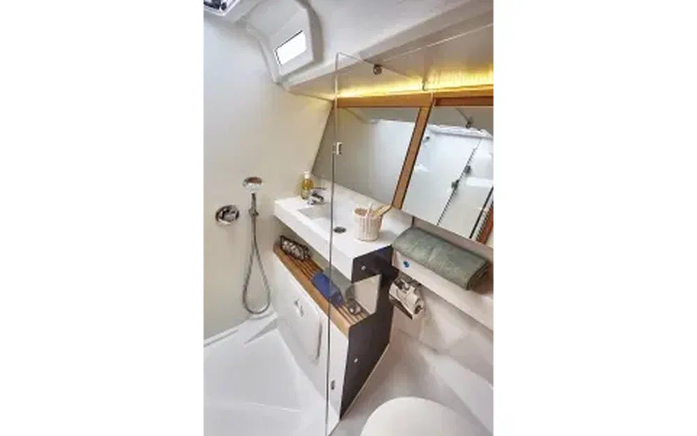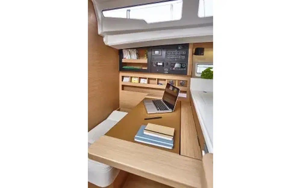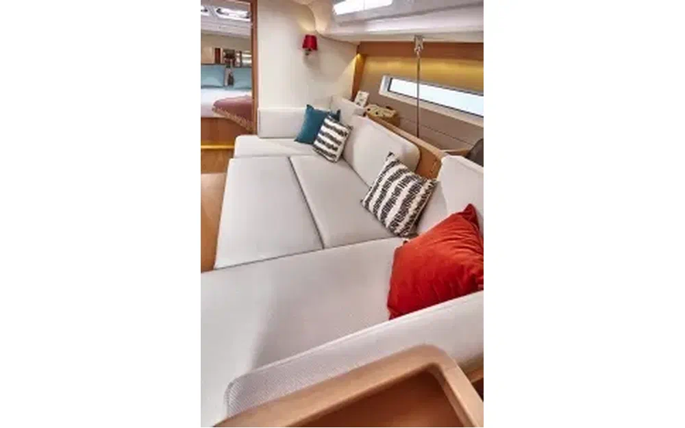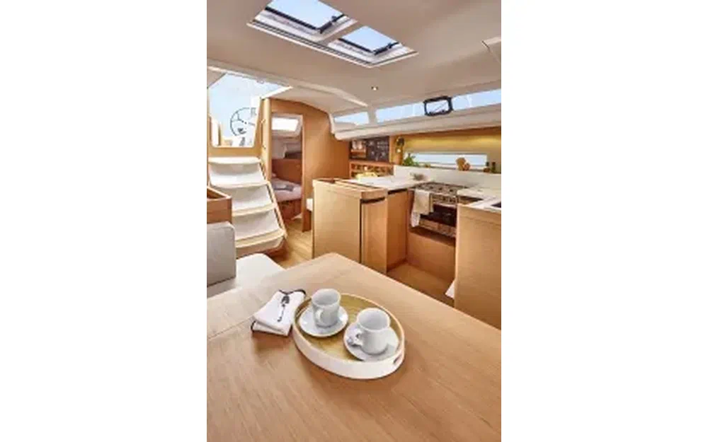 A l’intérieur, les lignes sont simples, la perception des volumes est agréable et facile. Ce voilier révèle une structure homogène, dédiée à l’aspect naviguant et aux joies de la vie à bord.