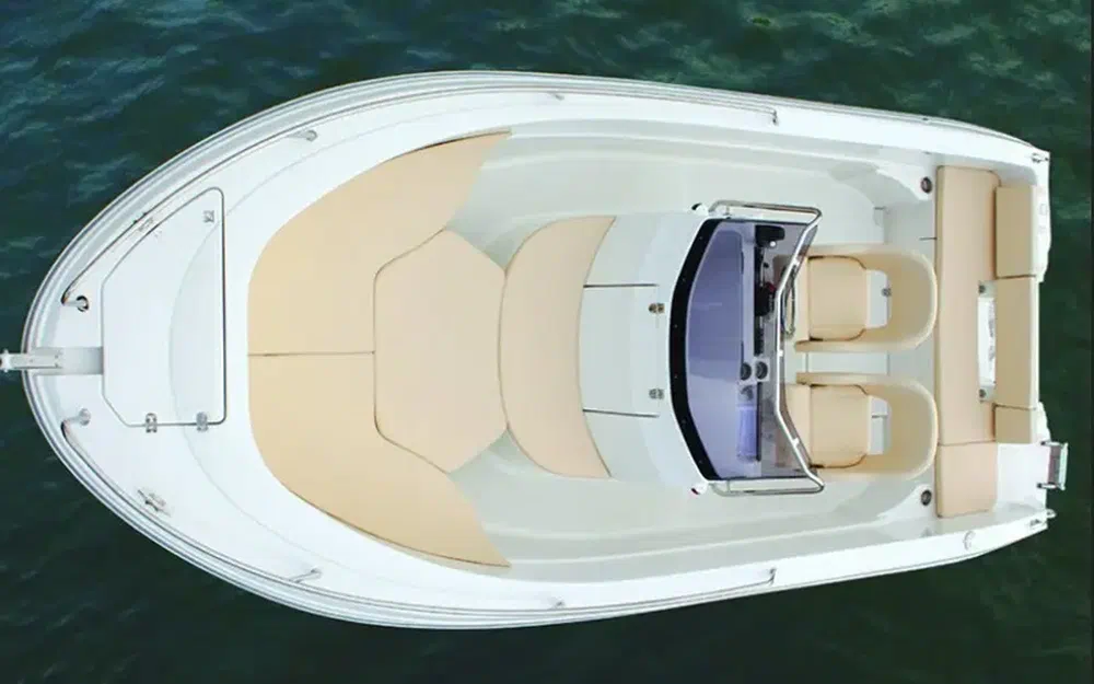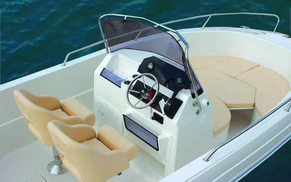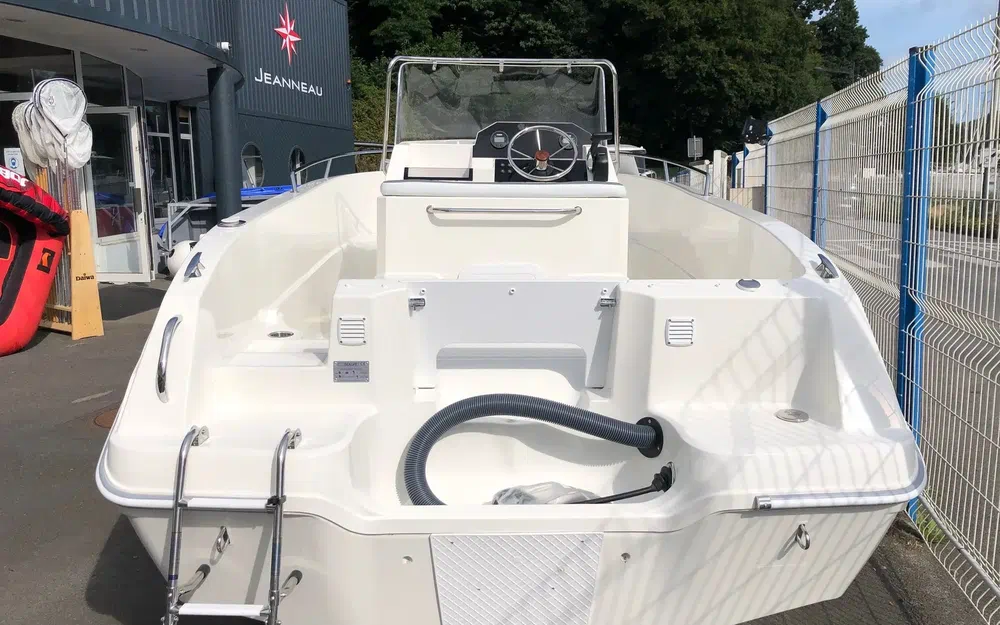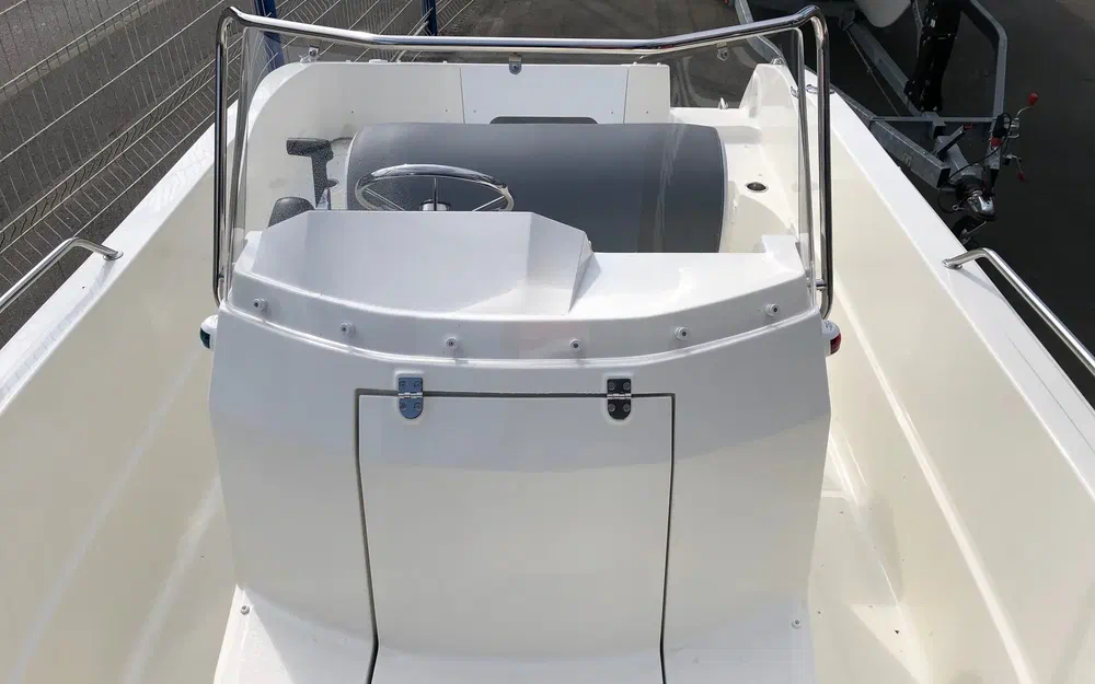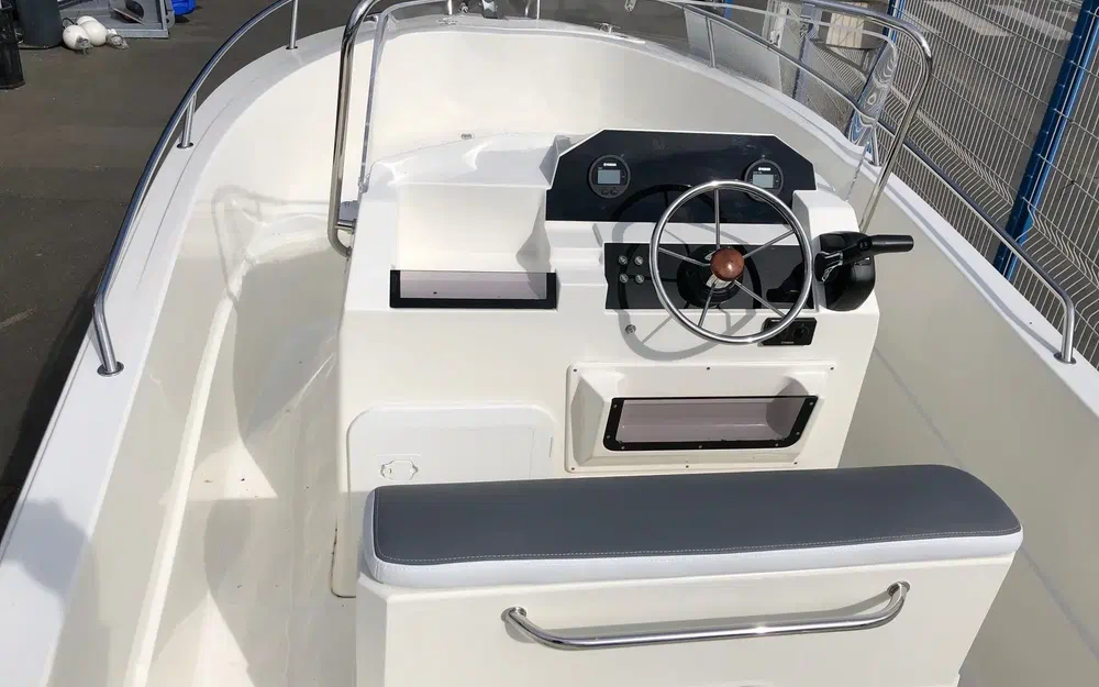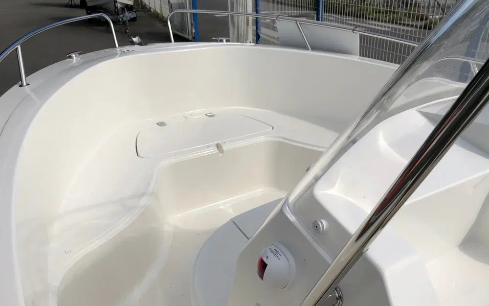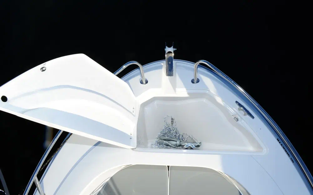 une vaste console, de nombreux coffres, une grande baille à mouillage et un accastillage de qualité.
